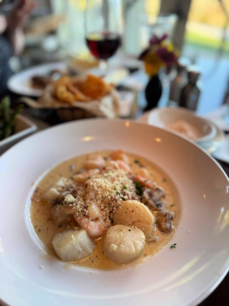 Two grilled chicken breasts, topped with a mix of shrimp, scallops, and mushrooms, all coated in a creamy seafood sauce, and finished with a bacon-cheese crunch. The textures, the flavors, the richness—every bite was incredible.