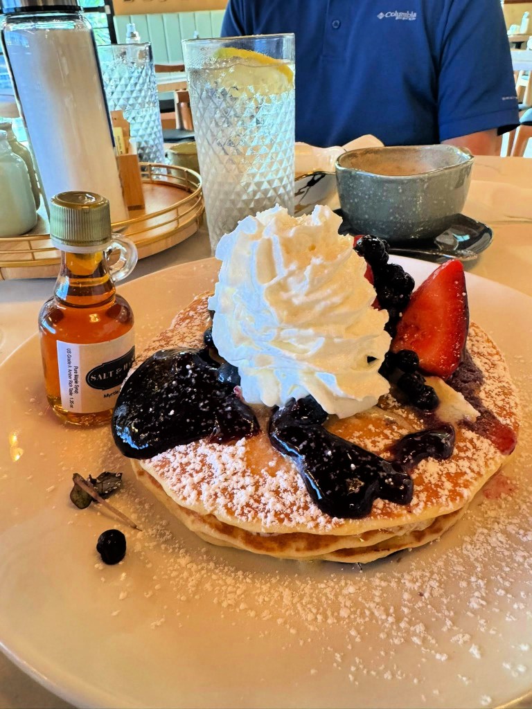 If you lean more toward sweet brunch options, you’re in for a treat. The Berry Pancakes were fluffy, fruit-filled, and stacked high, topped with a burst of fresh berries and a light dusting of powdered sugar.